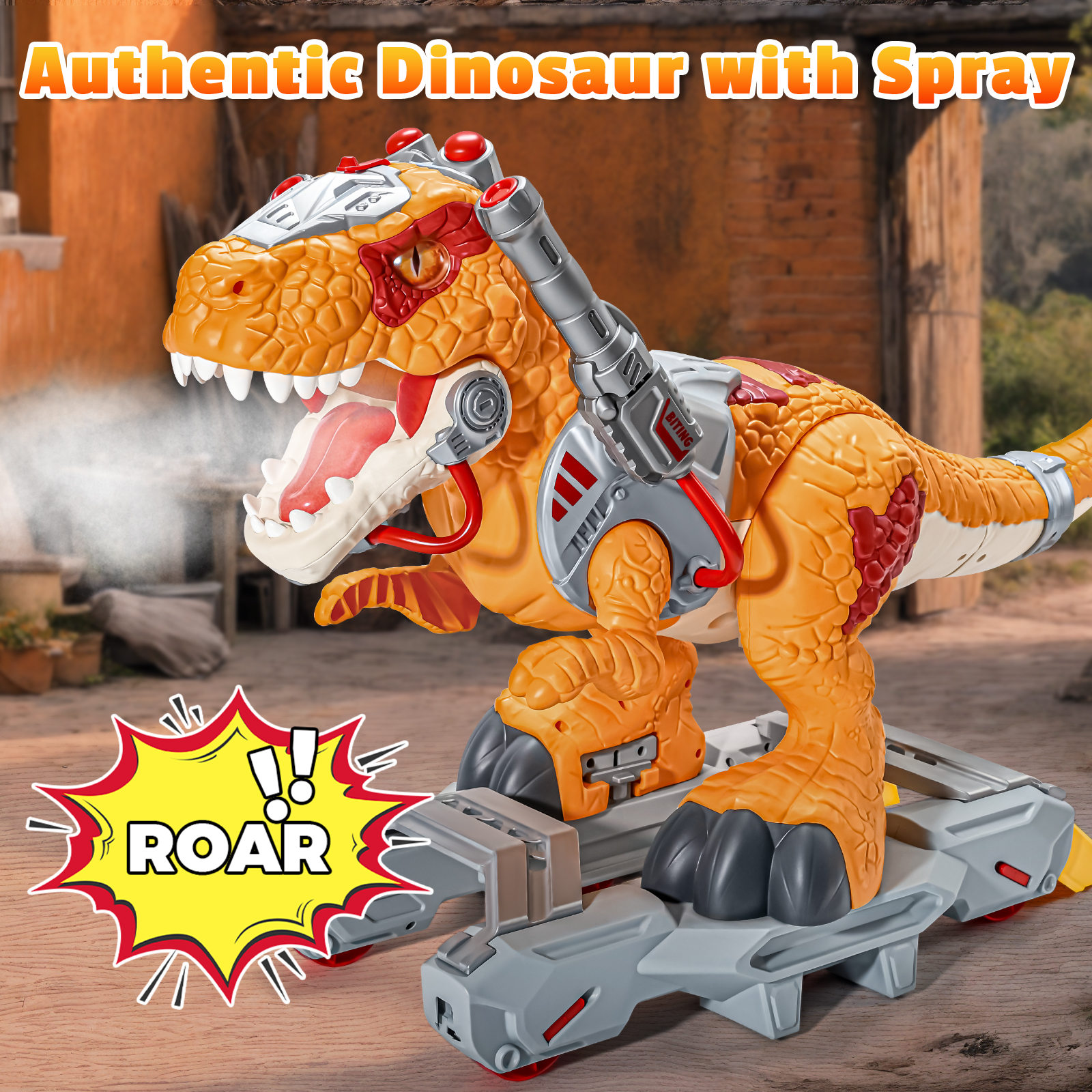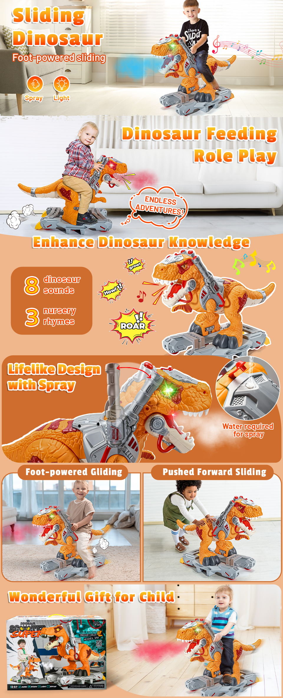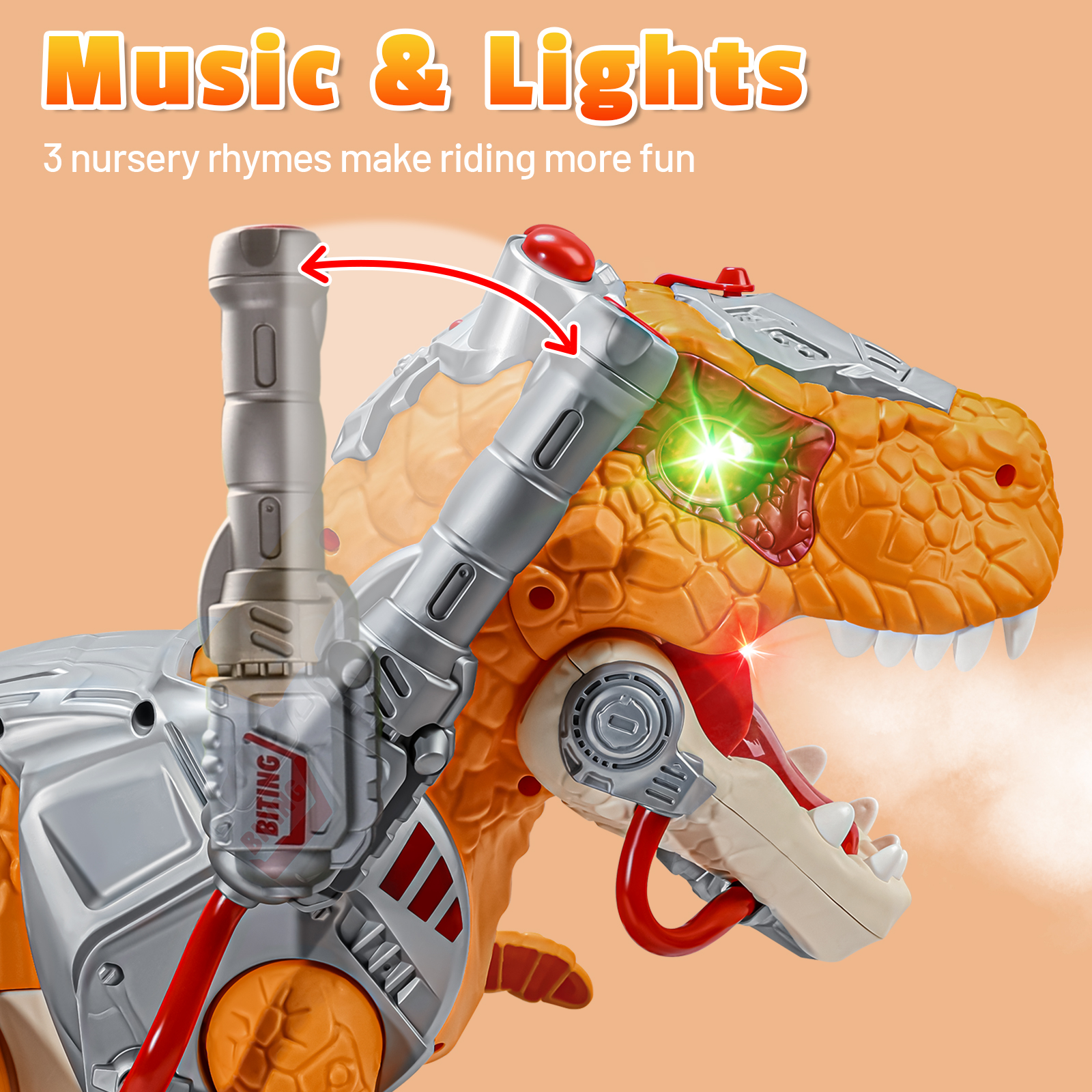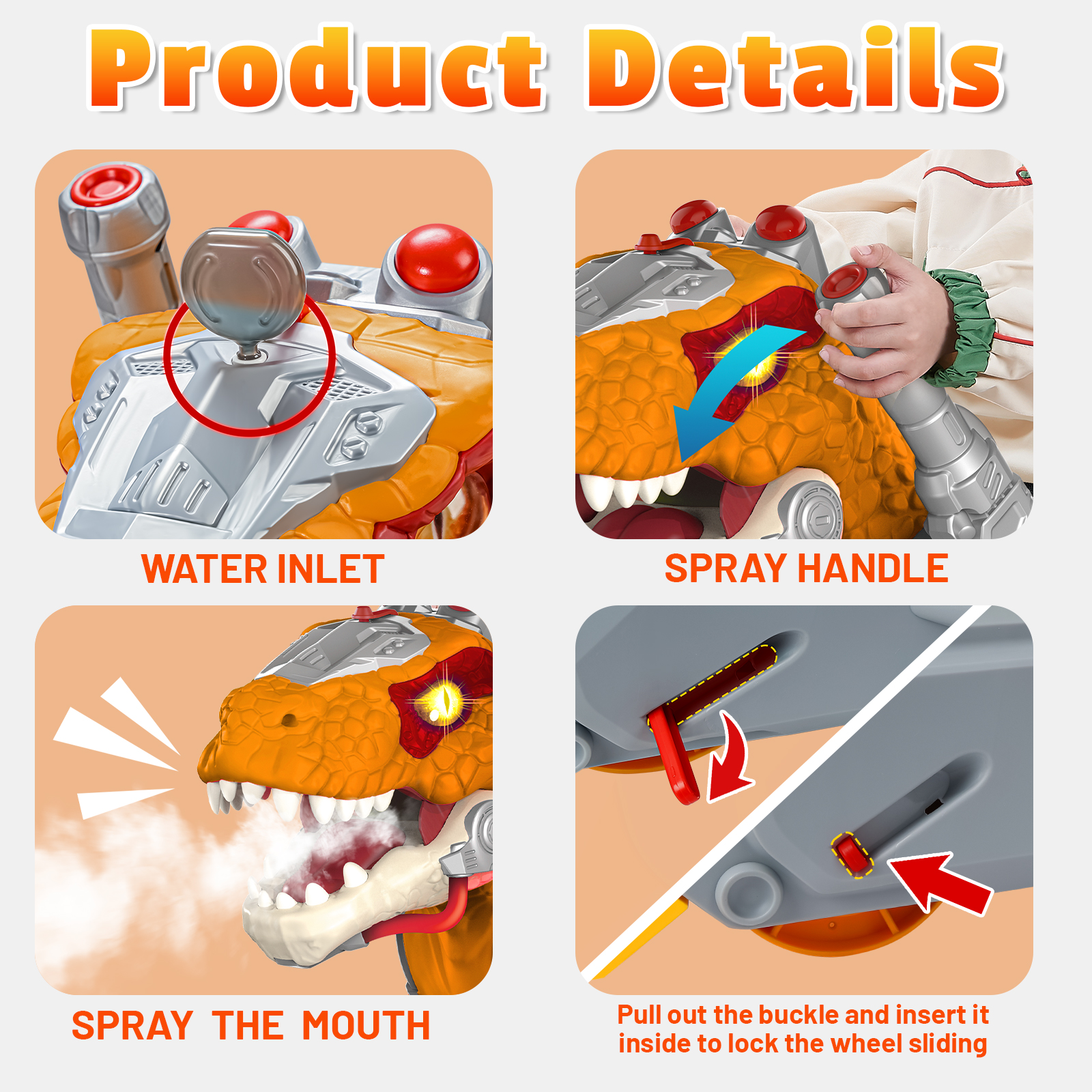- Our ride on toy features a mist spray function. Simply add water and pull the lever to see the dinosaur open its mouth, releasing cool mist with glowing eyes for a thrilling and realistic effect, adding more excitement and authenticity to the game