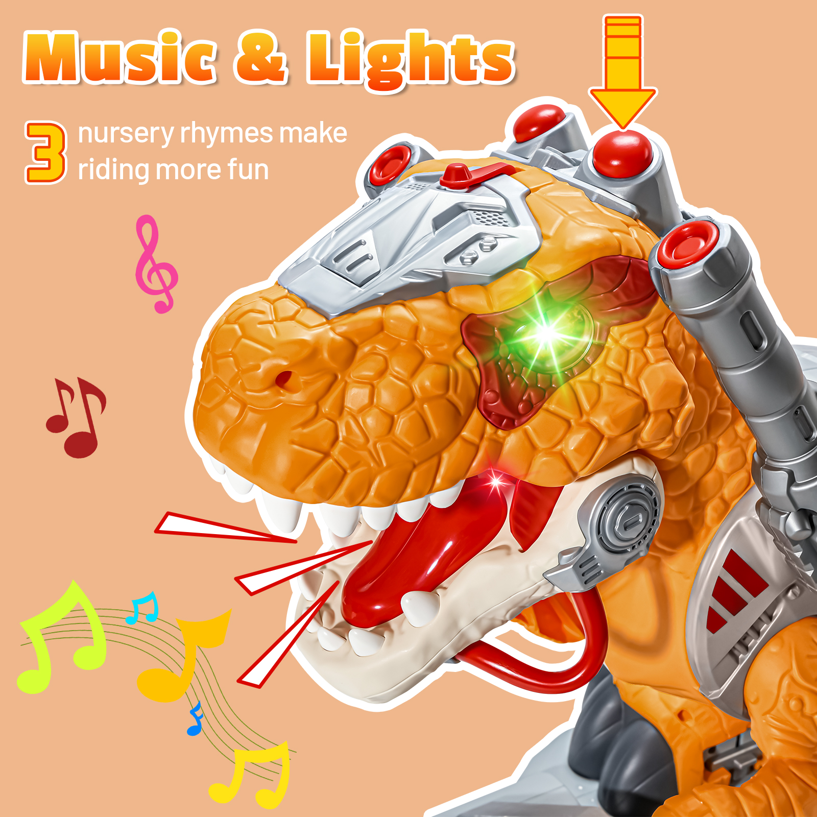 - Our dinosaur ride on toy car offers multifunctional fun! Kids can ride, enjoy lights, music, roaring sounds, and press buttons to hear 3 nursery rhymes and 8 dinosaur sounds, immersing children in the world of dinosaurs and feeling the majesty of the prehistoric giant