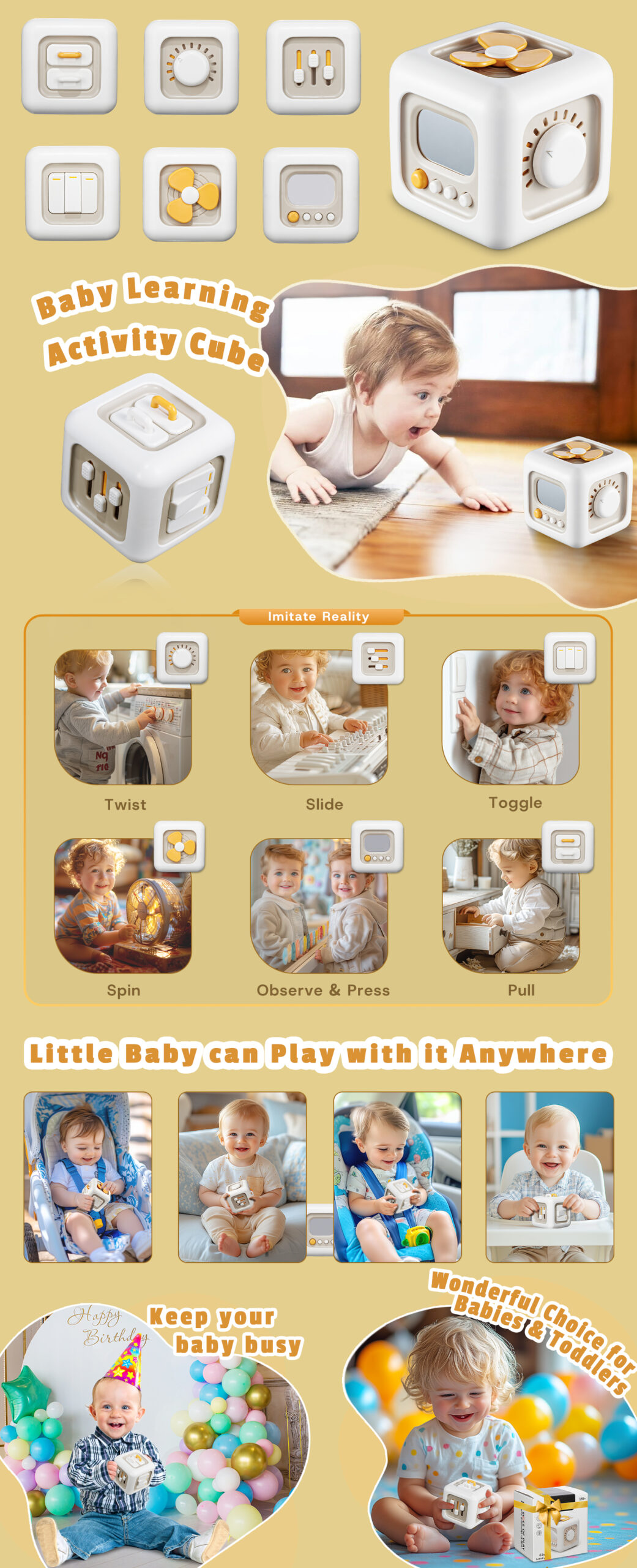 - This toy features a multifunctional design with six different interactive elements, including a mirror button, a light switch, a fan, a drawer, a microwave – like knob, and a left – right sliding switch.